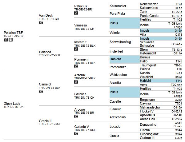 Grafenstolz’ sire Polarion qualified several times for World Cup finals as well as for European Junior Championship Finals with Laura Bechtolsheimer. His damline is outstanding: his mother is the full sister of the approved stallion Gipsy King, and produced also Gipsy Rose, dam of Grand Passion (CDI3* performer, at stud in France). The approved stallions Guy Laroche and Grimani (by Gribaldi) are also from this motherline. After his victories in the Bundeschampionnat 6 yo (he made the final of all three disciplines in the same year) and the World Eventing Championships in 2004 with his rider Michael Jung, Grafenstolz became a proven eventing sire, with young horse champions in four countries every year.