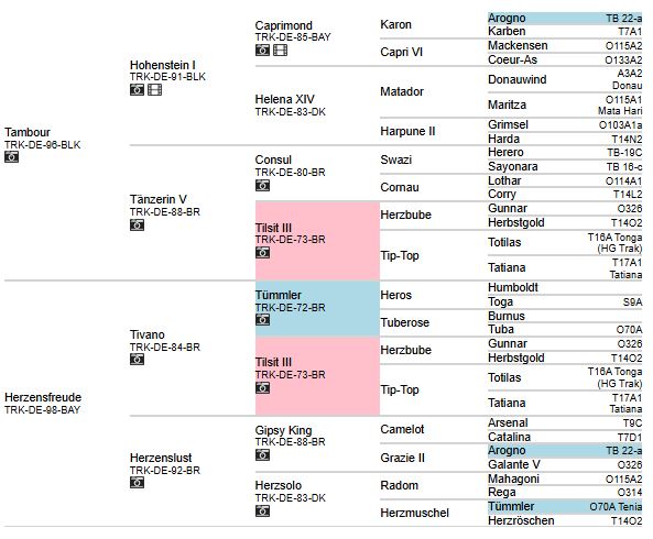His sire Tambour is also trakehner elite stallion. His dam StPr.St/El.St. Herzensfreude finished her mare test with the record mark of 9,11. His granddam St.P.St./El.St. Herzenslust is the halfsister to the premium stallion Herzkristall(by Goldino). Out of the H-line of stud panker resulted furthermore the champion stallion Herzzauber and the stallions Herzkönig,Herzbube and Herzfunke, as well as the sport horses like dressage star Harlem and highly ranked mares.