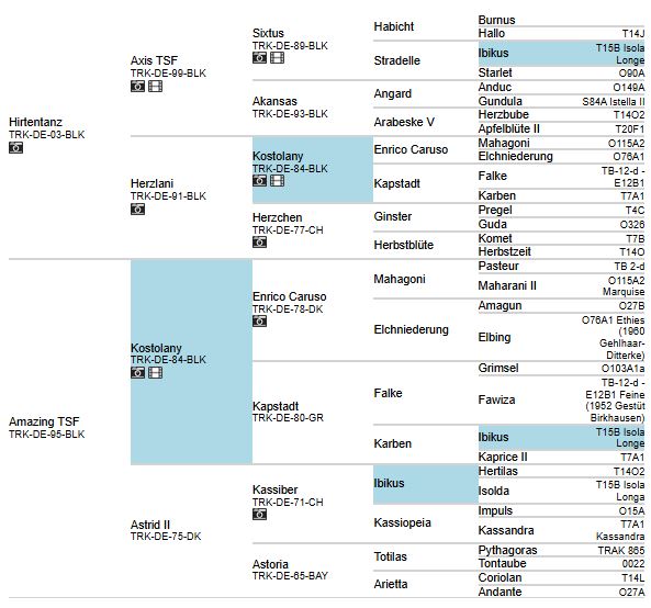 Amazing, three times awarded mother (mare test 8.70) of Abendtanz, was a successful show jumper up to M/A level. Amazing as well as Herzlani stem from Kostolany, crowned Stallion of the Year in 2009.